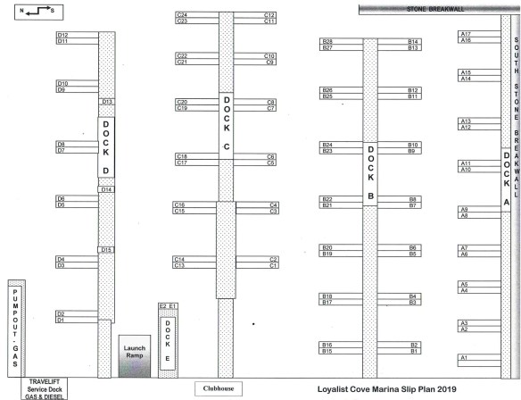 Loyalist Cove Marina has 4 main sets of docks labeled A, B, C, D. The south stone breakwall dock is A and moving north are B, C and D (most northern set of docks)